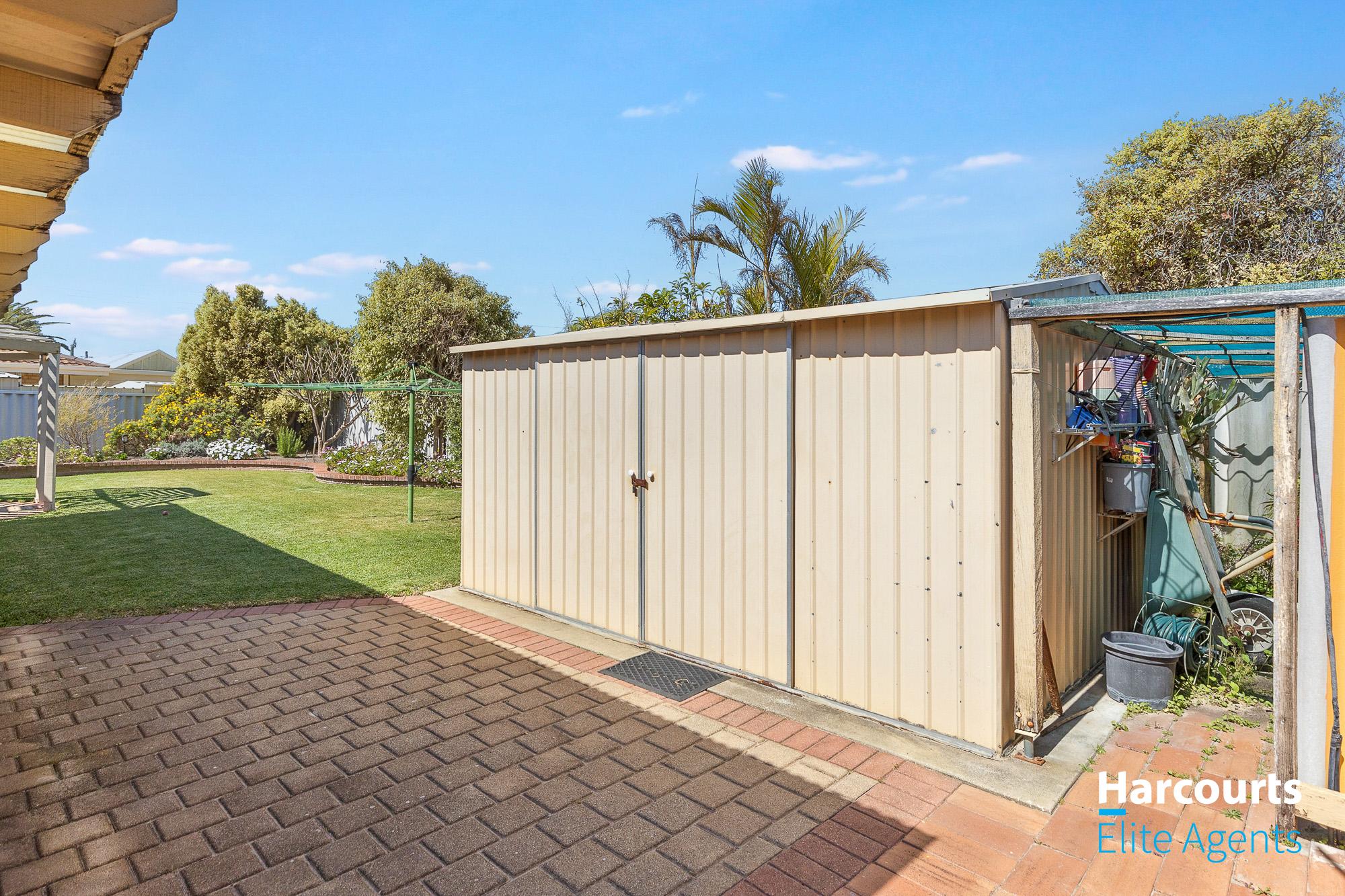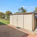 – Outside, the reticulated back lawn is bordered by gardens and greenery, with a garden shed for tool storage