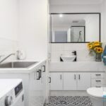 – A stylish and practical bathroom includes a built-in laundry nook, a glass-framed shower, WC, and modern finishes
