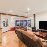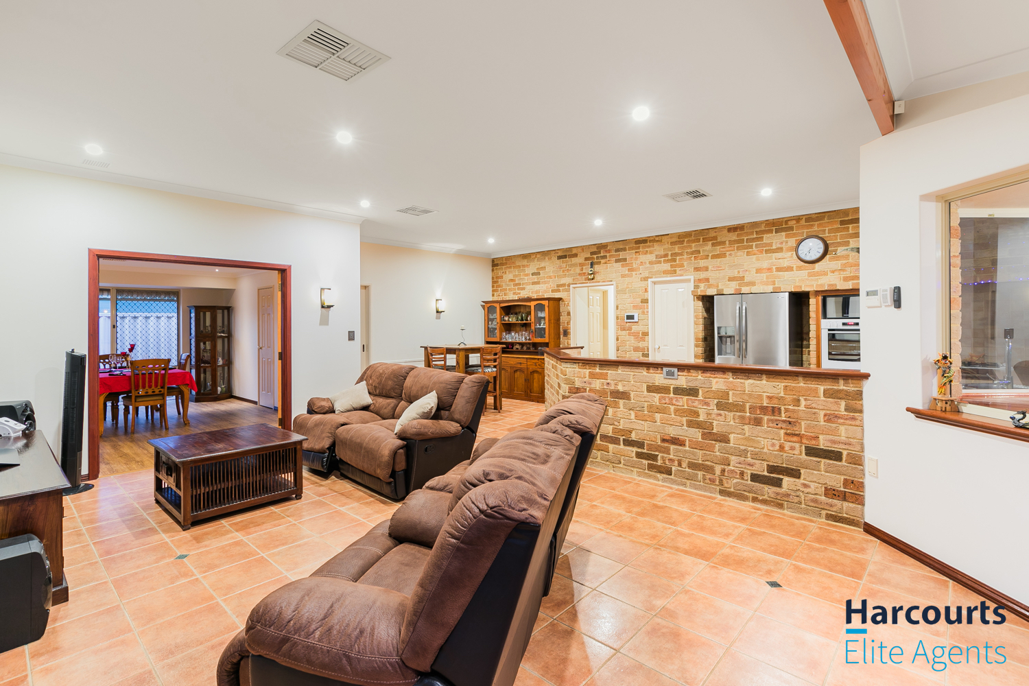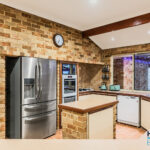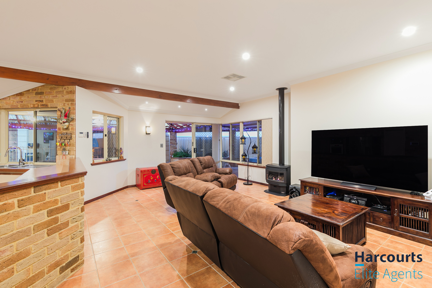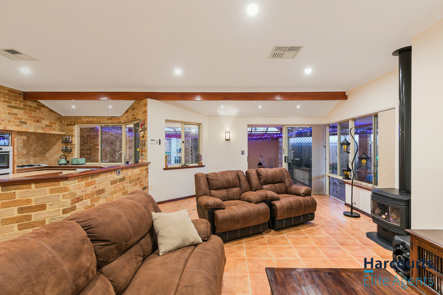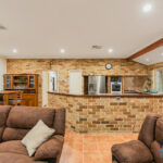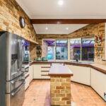 – Expansive open-plan kitchen, dining, and family living area with exposed brick walls, high ceilings, and a cozy gas fired remote controlled heater, complemented by large windows offering views of the outdoor entertaining zones
