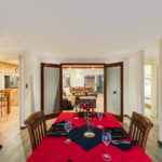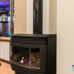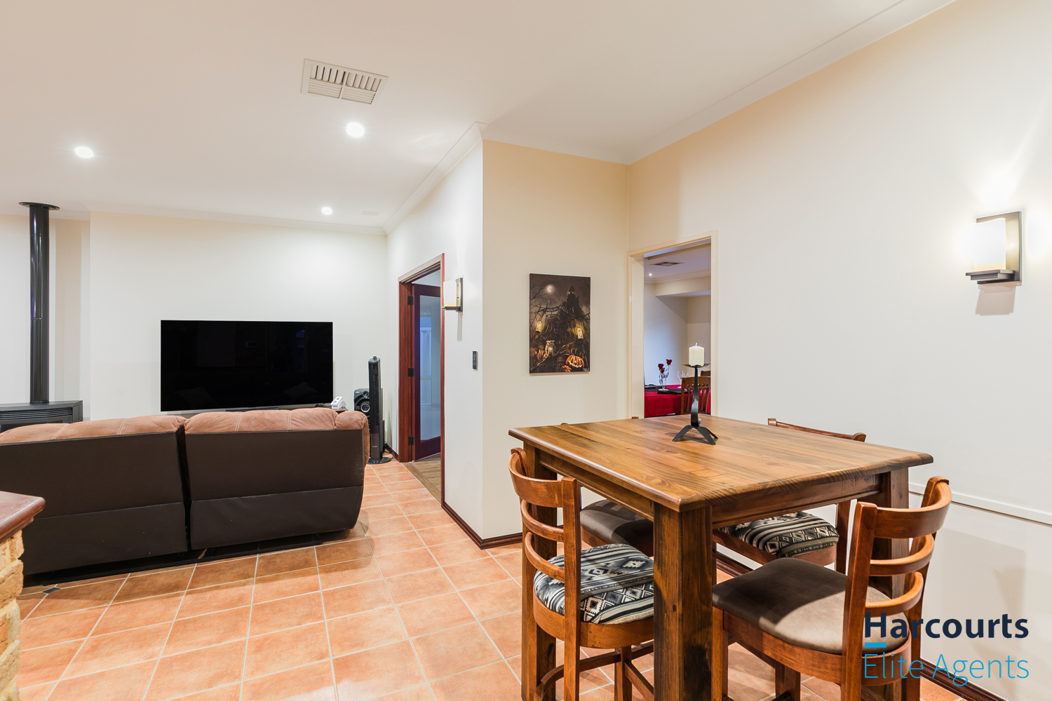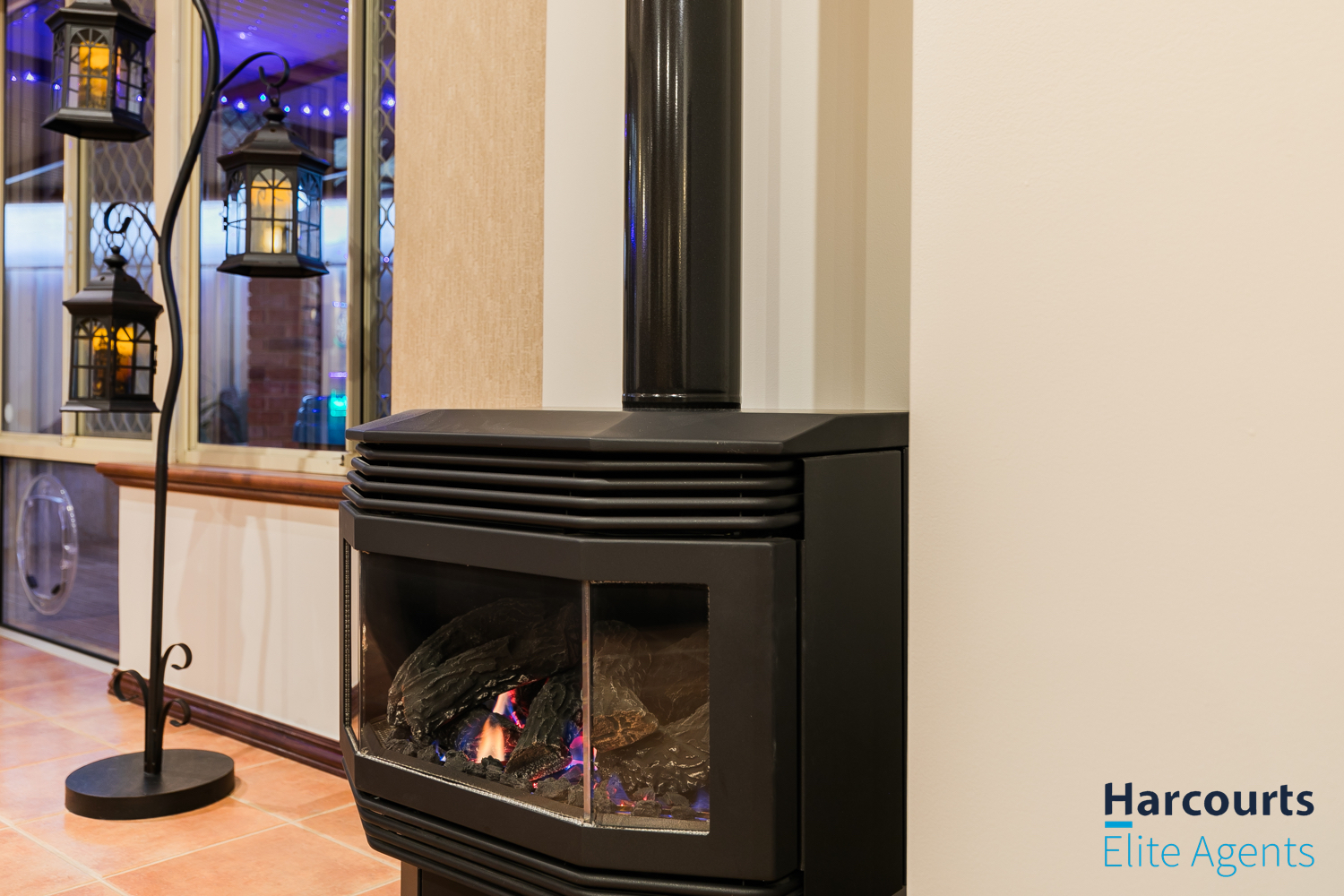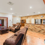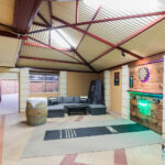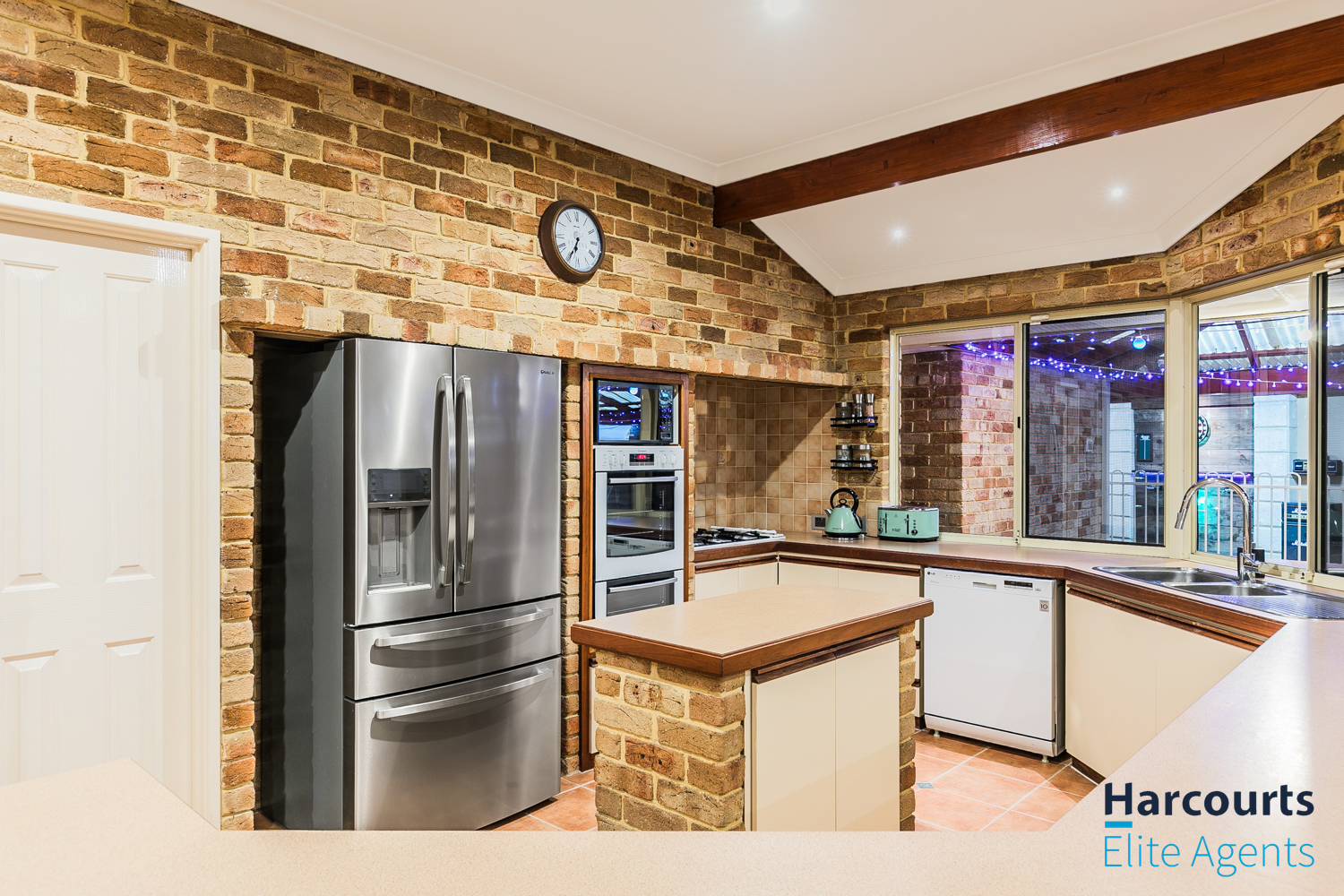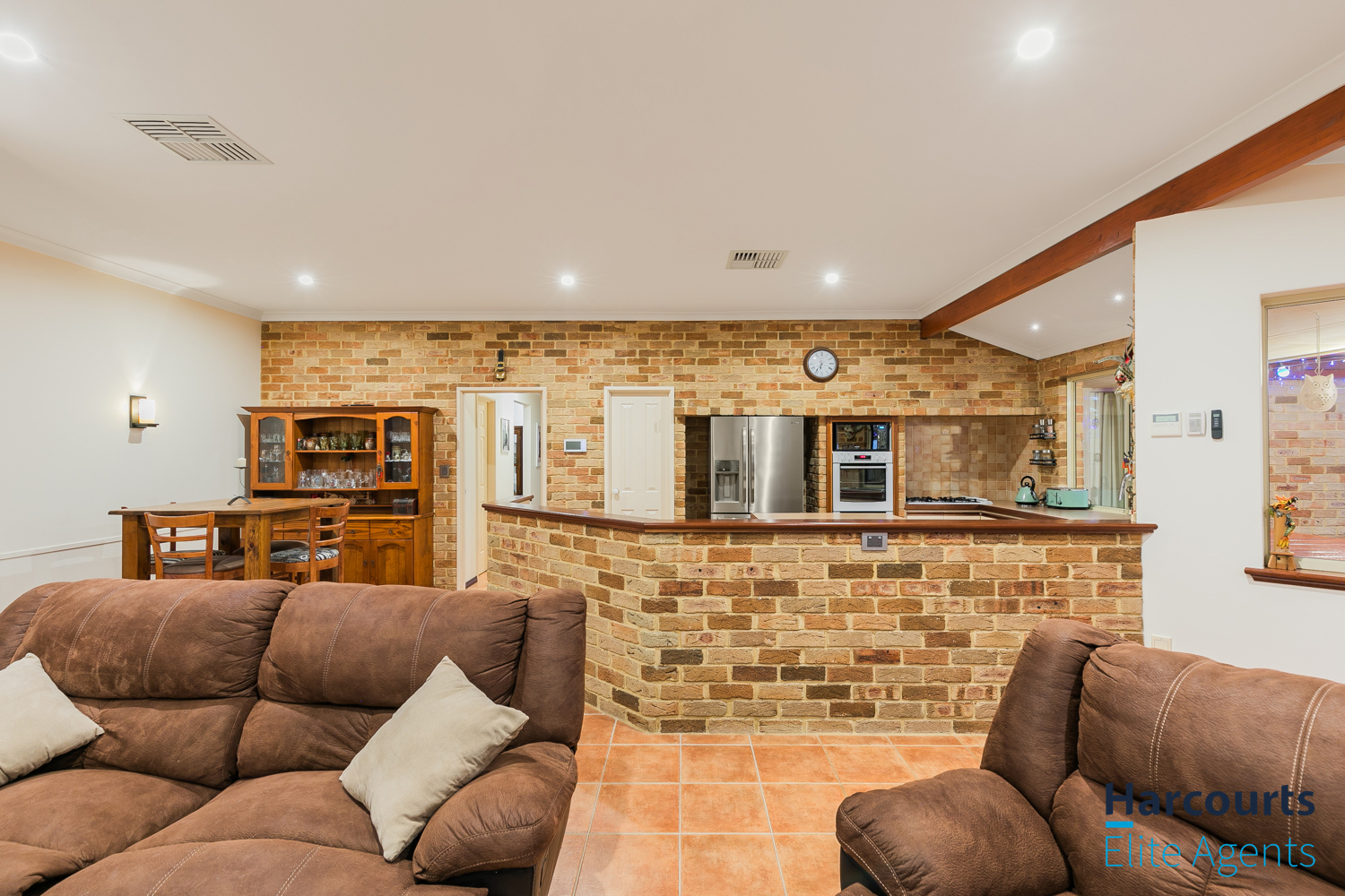 – Expansive open-plan kitchen, dining, and family living area with exposed brick walls, high ceilings, and a cozy gas fired remote controlled heater, complemented by large windows offering views of the outdoor entertaining zones