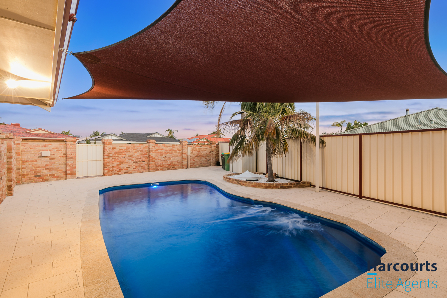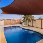– Sparkling below-ground swimming pool with a shade sail for sun protection