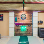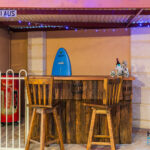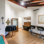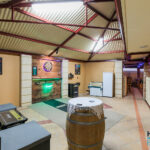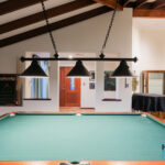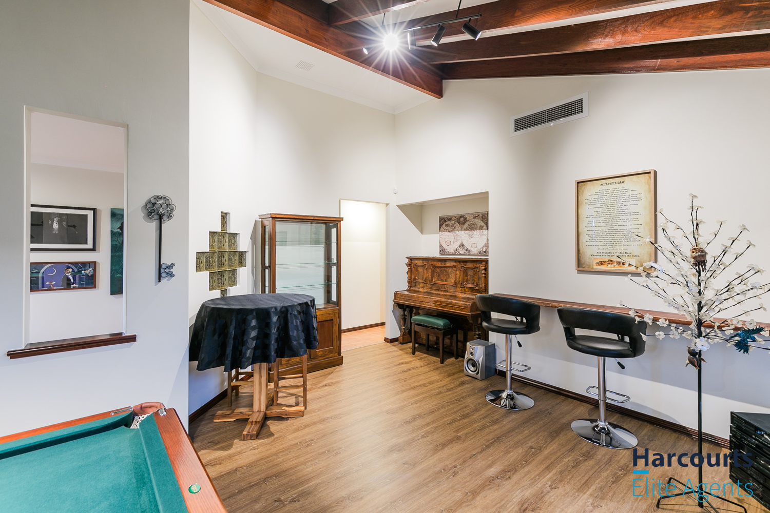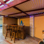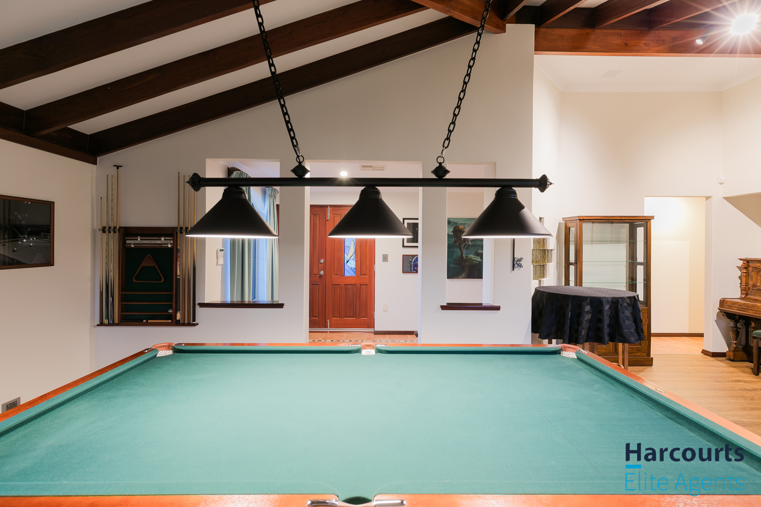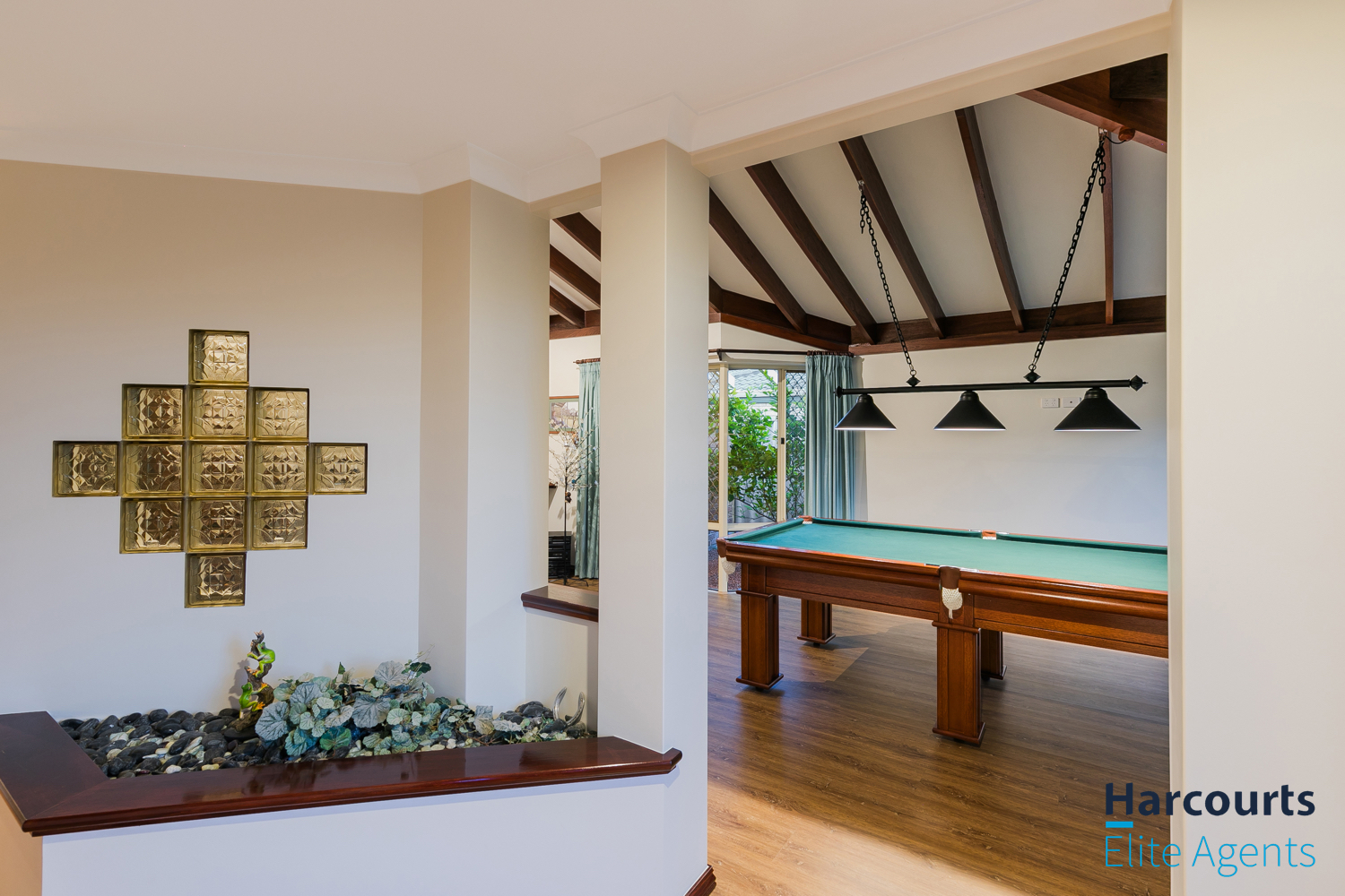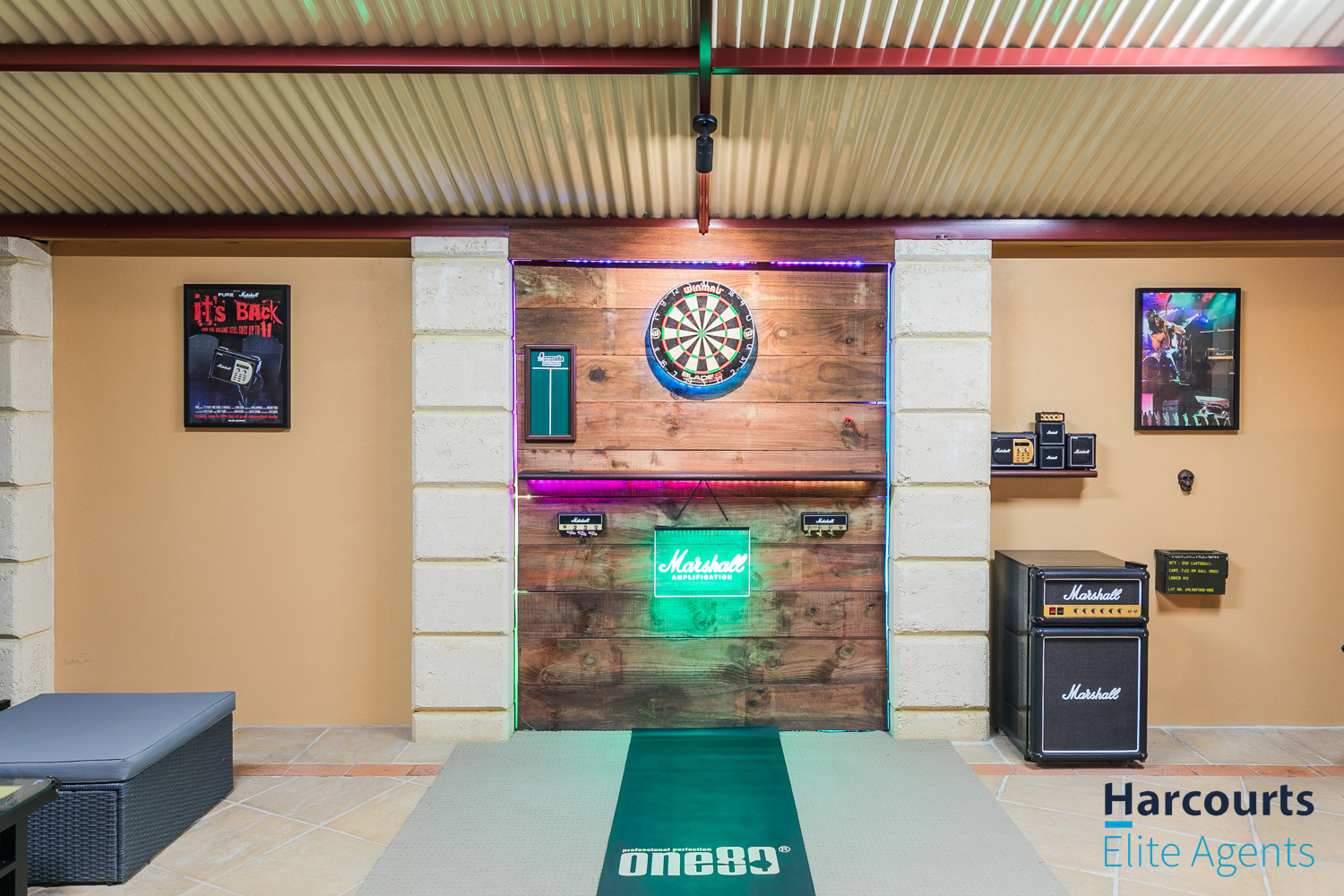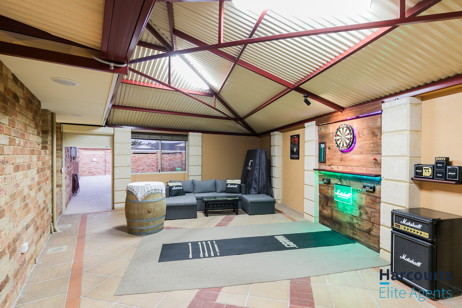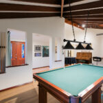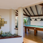 – Through the gate, a multipurpose games room offers direct entry to the pool area and is equipped with power, lighting, and ceiling speakers for added enjoyment