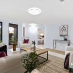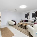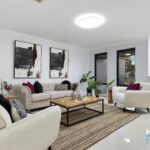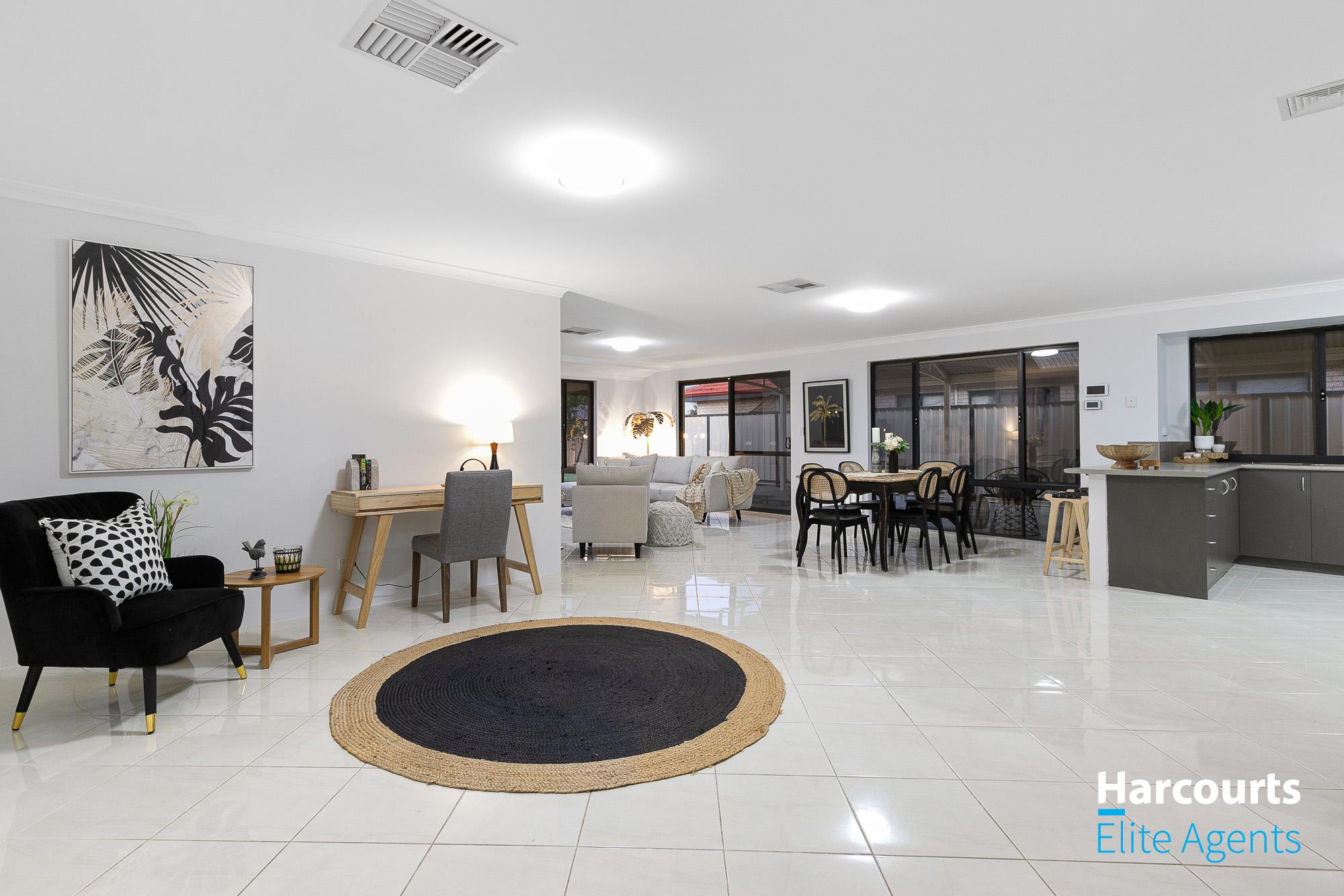 – Stepping through the front entry and separate lounge room, we are welcomed into the central living areas with views over the rear yard and alfresco area