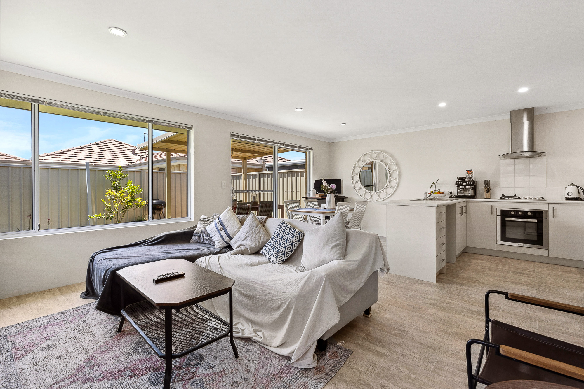 – With ample natural light and a welcoming ambiance, the open-plan living area features a modern kitchen, dining space and functional layout for relaxation and entertaining,