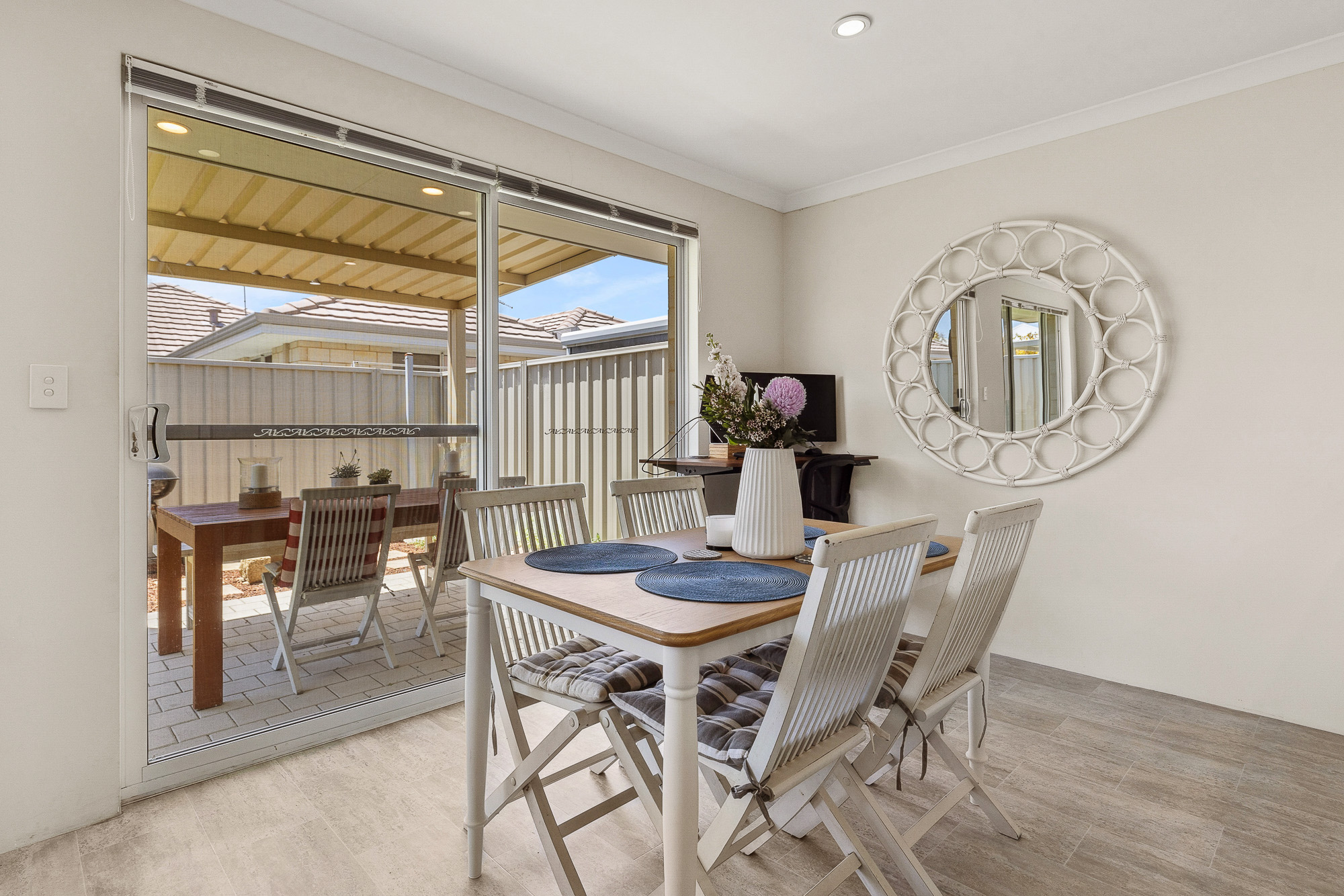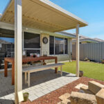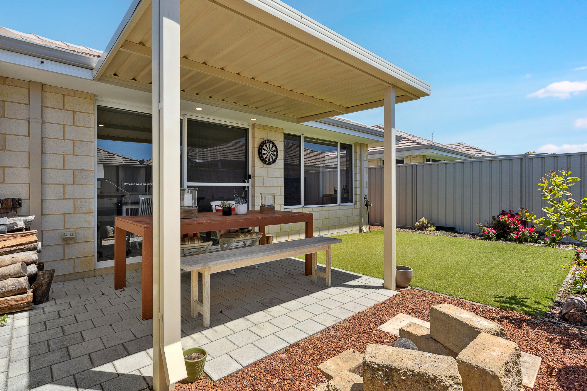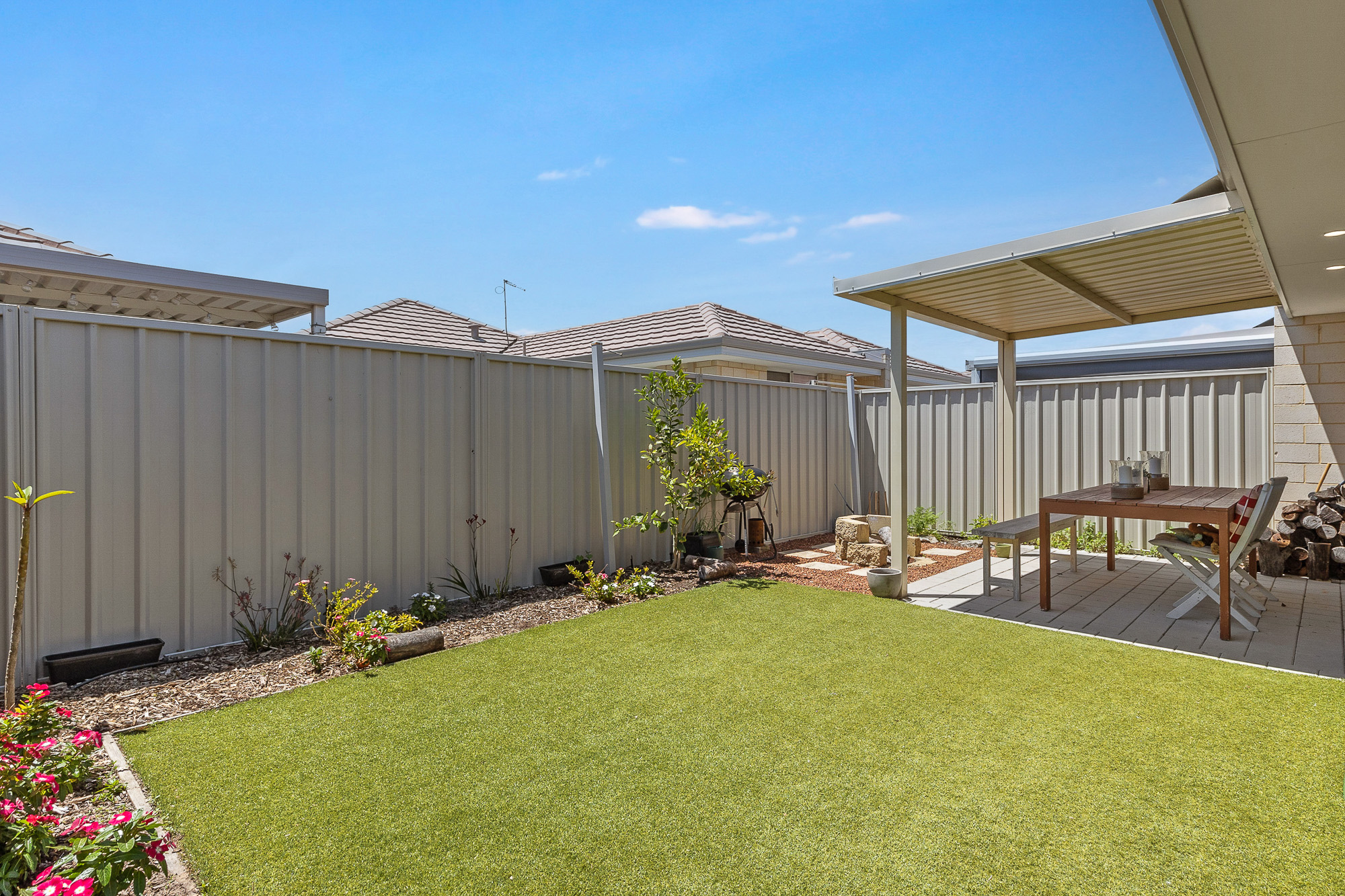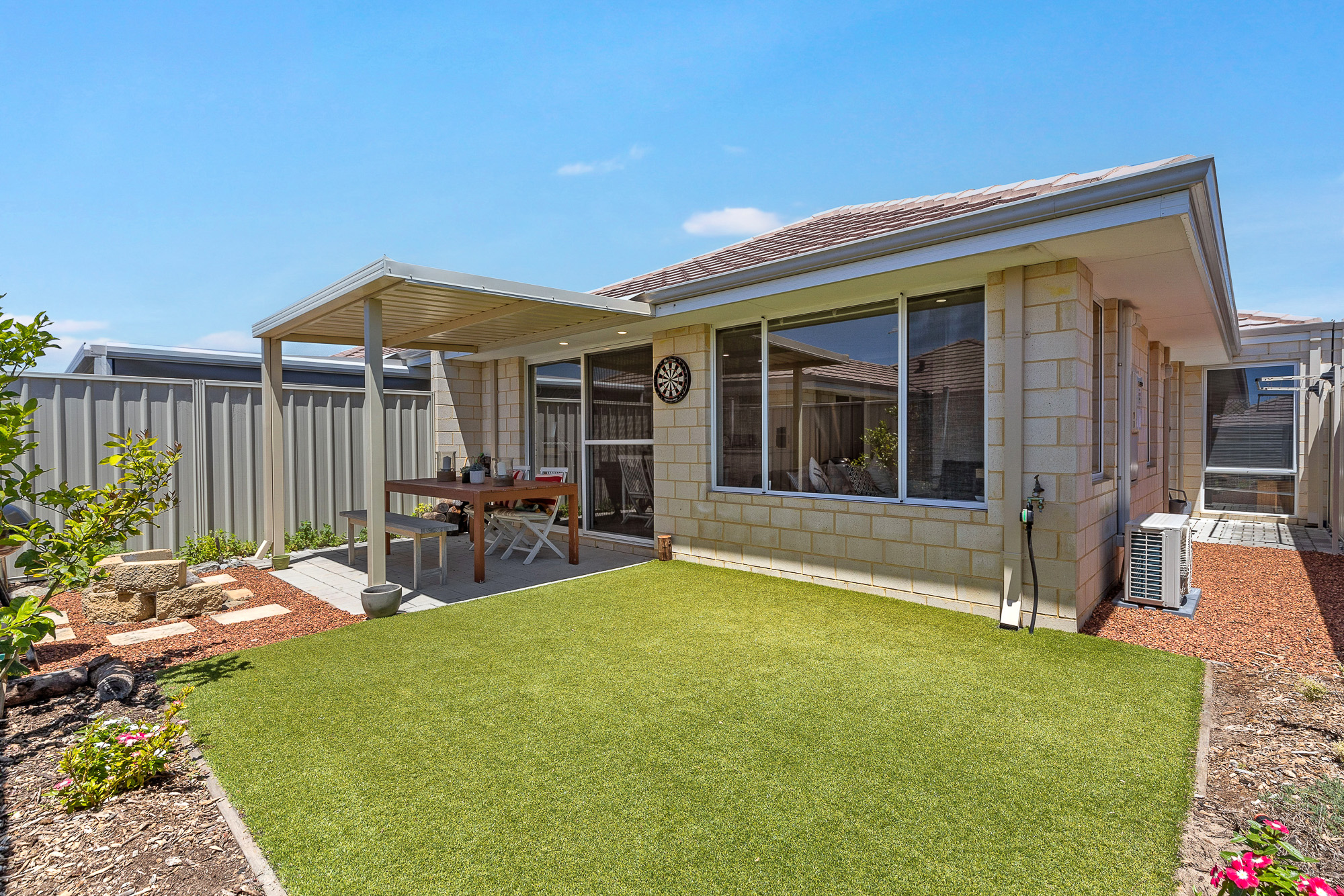 – The low maintenance outdoor area is landscaped for easy upkeep, with a shaded area for alfresco dining, and an open space with artificial turf