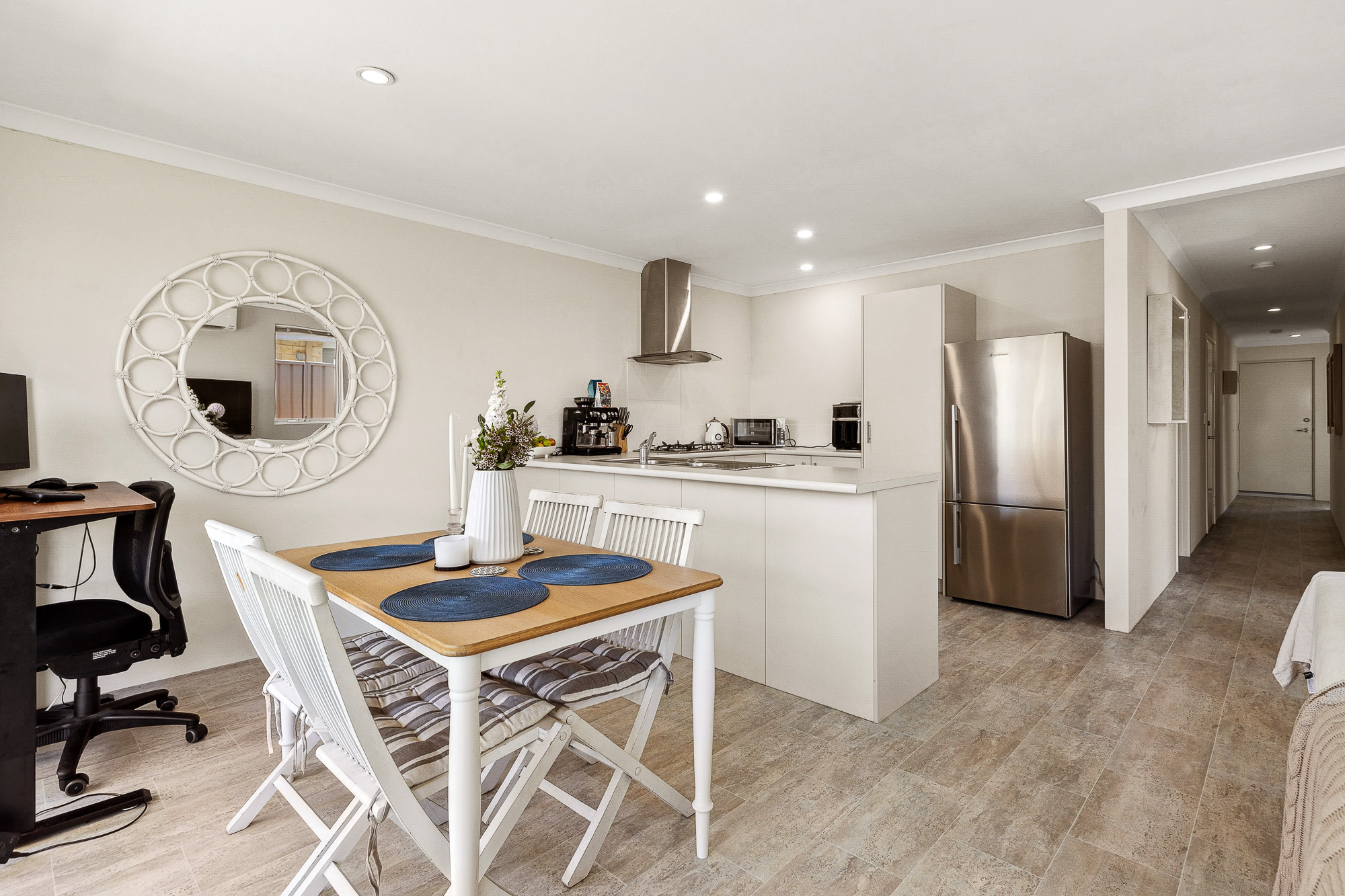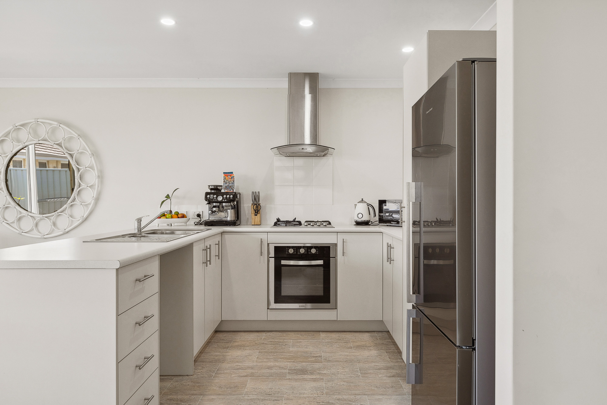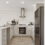 – Well appointed, the modern kitchen boasts sleek cabinetry, stainless steel appliances, dishwasher recess and ample counter space, creating a stylish and functional space for cooking